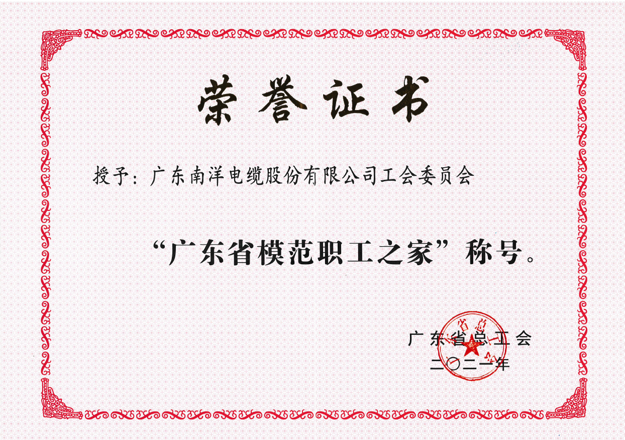 廣東南洋電纜股份有限公司工會(huì)委員會(huì) 被授予“廣東省模范職工之家”榮譽(yù)稱號(hào)